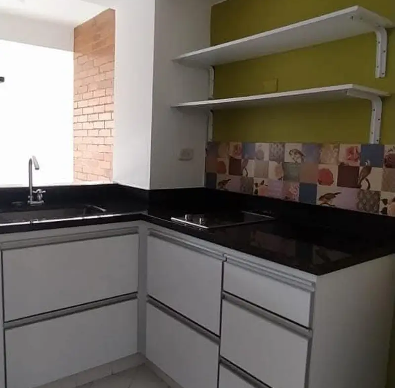 Primera planta: Área social, piso en cerámica, cortina estilo panel japonés. Cocina, estufa vitrocerámica eléctrica 220V, lavadero, espacio para lavadora y nevera.