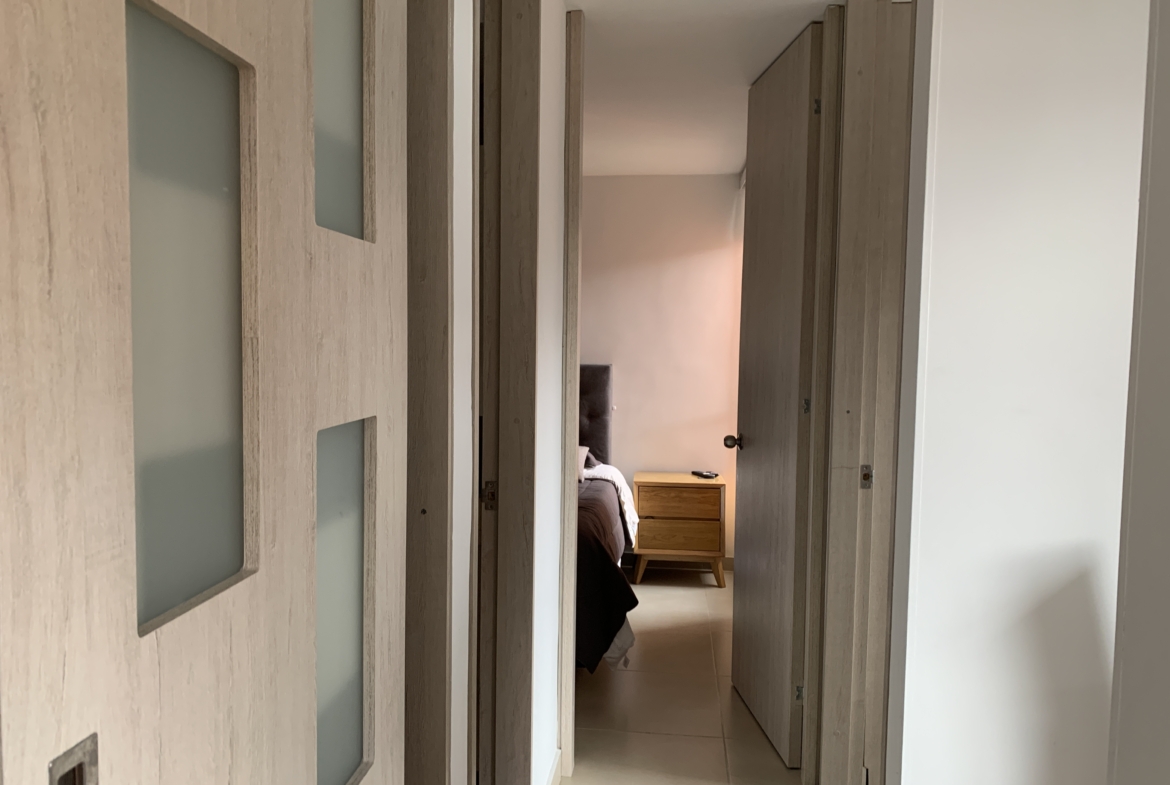 Apartamento en tercer piso, acceso por escaleras, interior, 52 m2, 2 habitaciones, un estudio, closets y walking closet, cocina integral, 2 baños, zona de ropas, calentador a gas, parqueadero descubierto por asignación de la administración, terminado, se entrega con lámparas, encortinado, y black out. El conjunto es cerrado con 24 horas de vigilancia, parqueadero para visitantes, parque infantil, bicicletero, gimnasio, parqueo para motos, salón social, zona de bbq. Sobre la variante Chía- Cota, muy cerca a la avenida Padilla, Centro Comercial Plaza Mayor, Centro Chía, Centro Comercial Fontanar, Universidades como La Sabana, Militar, Manuela Beltrán, a la Clínica de La Sabana, Restaurantes como Andrés Carne de Res, El Botalón, El Corral. Excelente ubicación con buen transporte municipal.