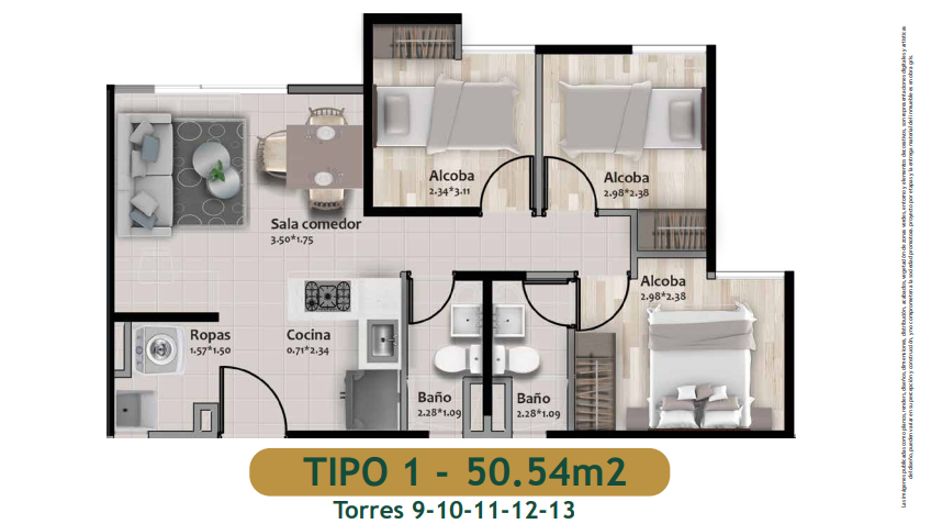 Sin acabados de 2 alcobas, 2 baños, sala comedor, cocina con un area de 50,54 m2