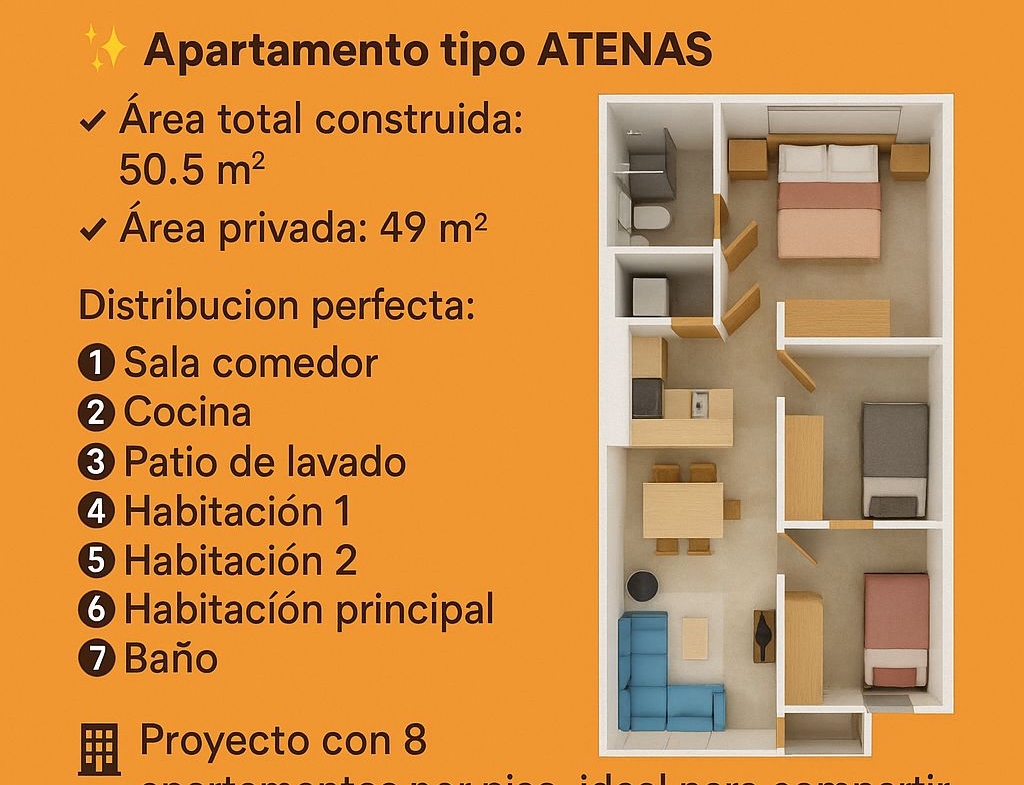 🏢 Proyecto con 8 apartamentos por piso, ideal para compartir en familia y vivir con tranquilidad.