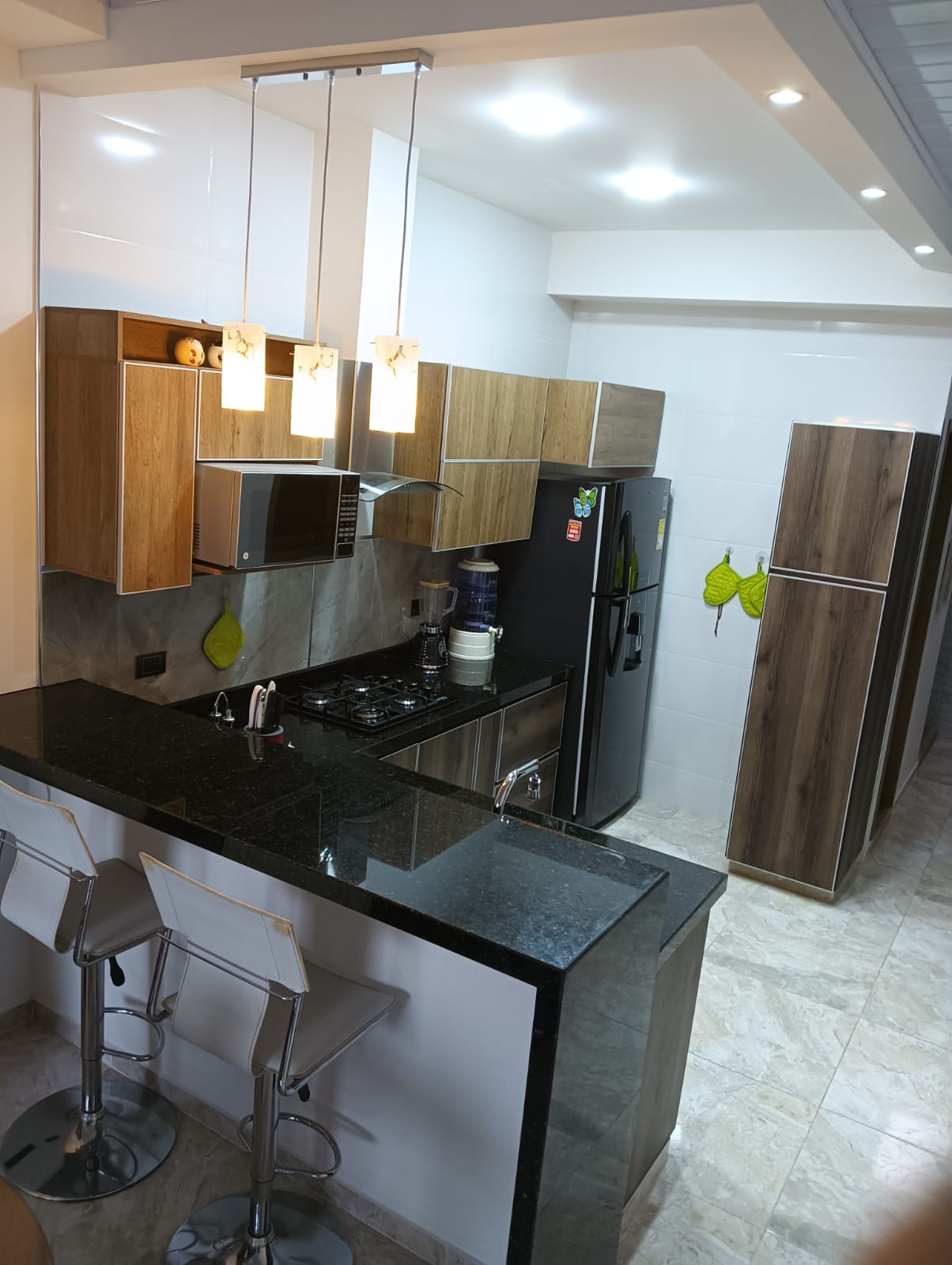Cocina semi integral con barra en mármol
