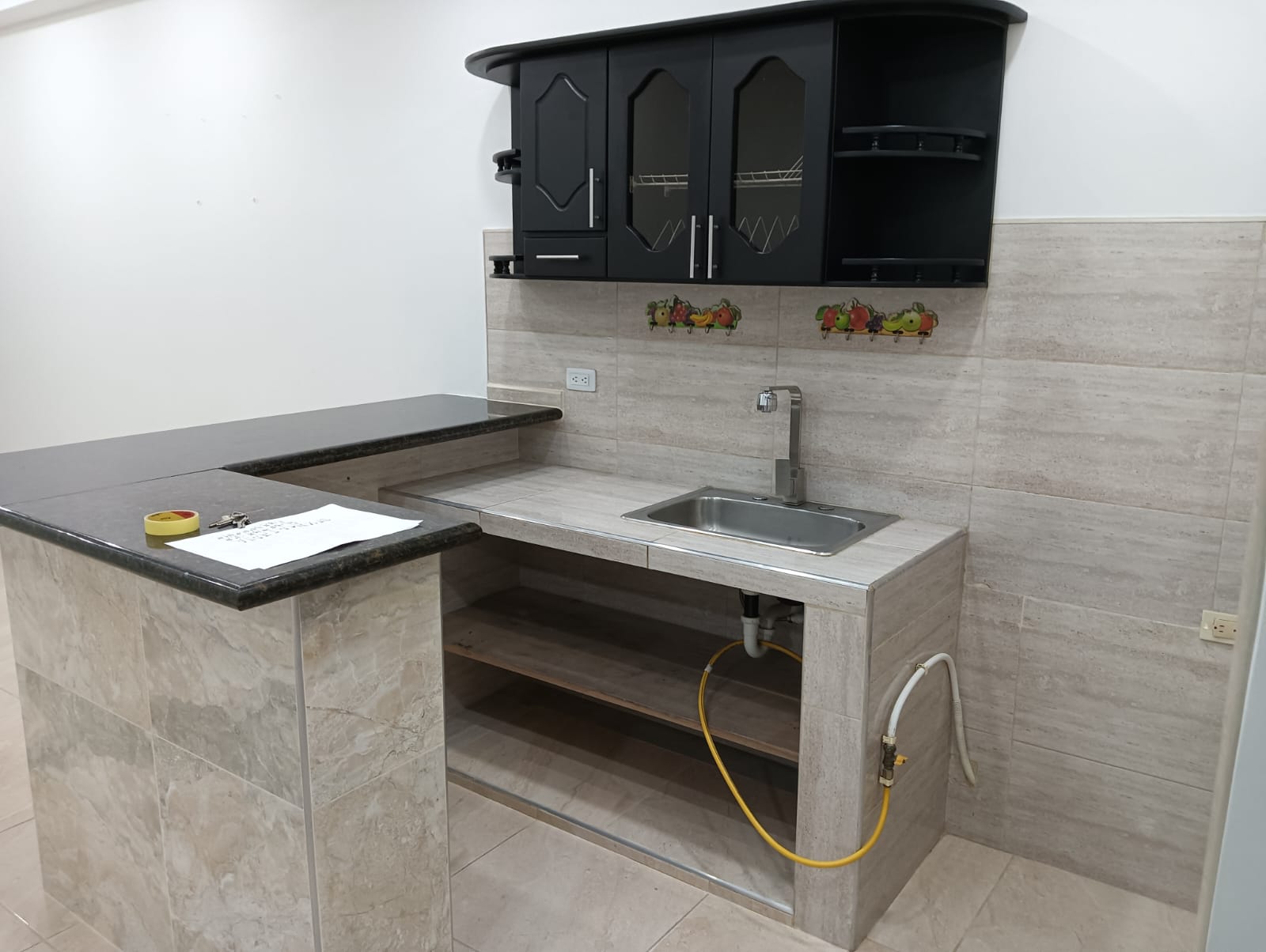 Cocina integral con mesón en mármol y campana extractora