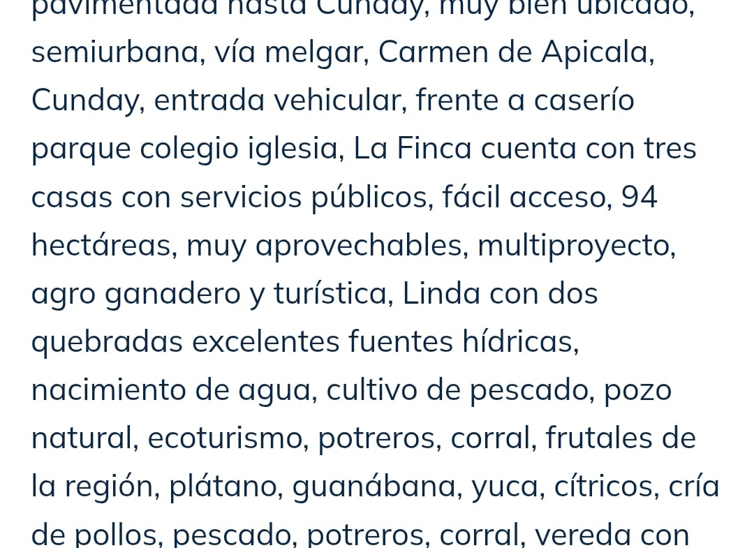 La finca cuenta con tres casas con servicios públicos, fácil acceso, 94 hectáreas muy aprovechables. Es multiproyecto: agro, ganadero y turístico.
