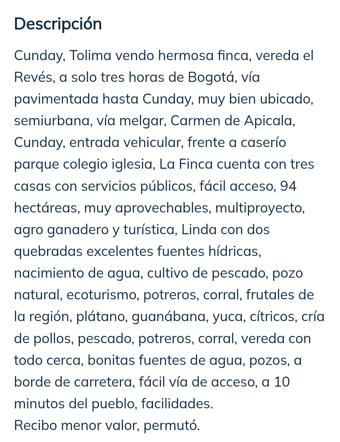 Cunday, Tolima. Vendo hermosa finca en la vereda El Revés, a solo tres horas de Bogotá, vía pavimentada hasta Cunday. Muy bien ubicada, semiurbana, vía Melgar, Carmen de Apicalá, Cunday. Entrada vehicular, frente a caserío con parque, colegio e iglesia.
