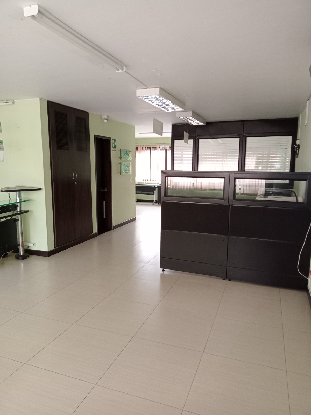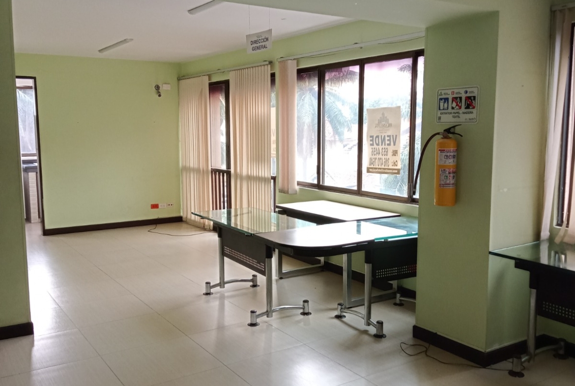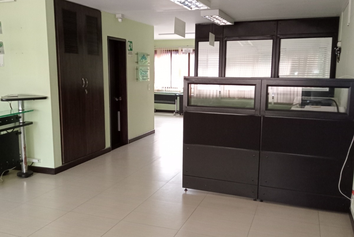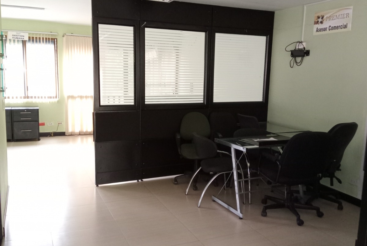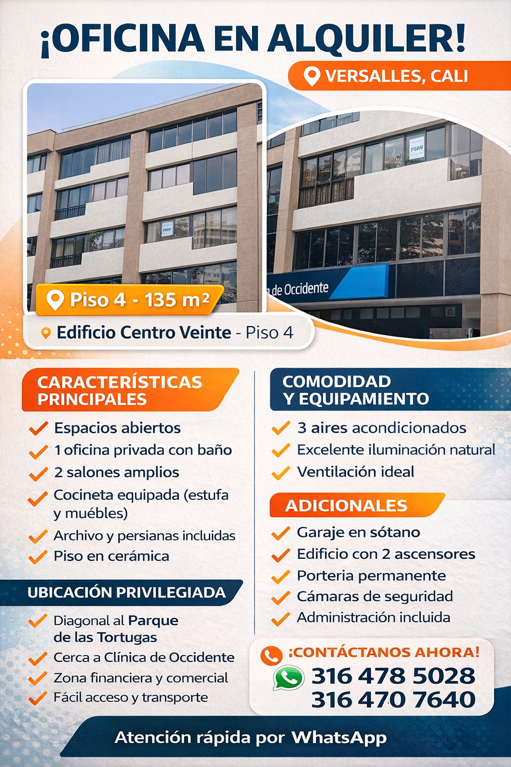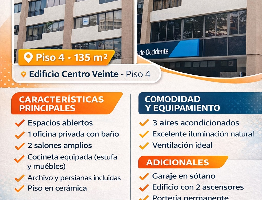 Oficina en arriendo de 135 m² ubicada en cuarto piso, con excelente iluminación natural y ventilación. Cuenta con amplios espacios abiertos, una oficina privada con baño, dos salones independientes, cocineta equipada con estufa, mobiliario funcional como armarios y archivo, persianas y piso en cerámica.