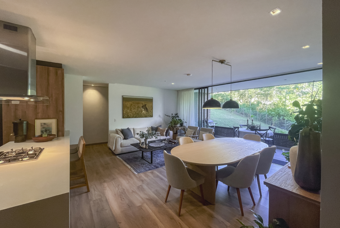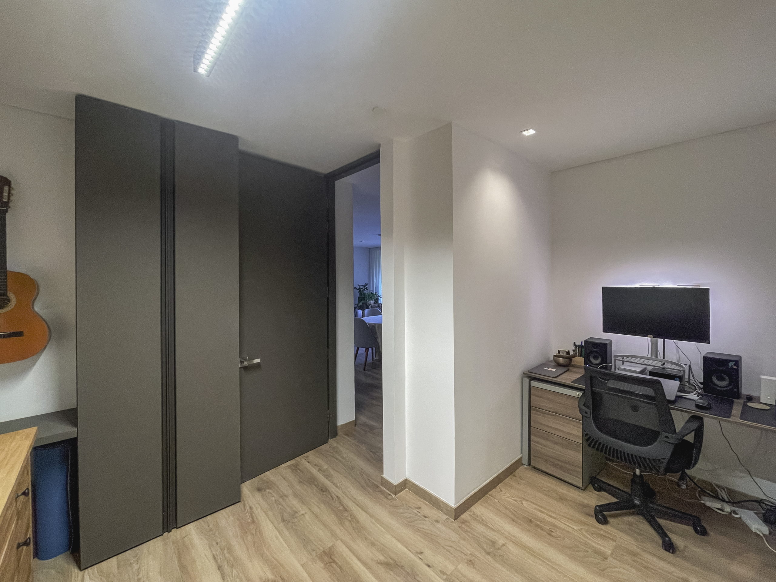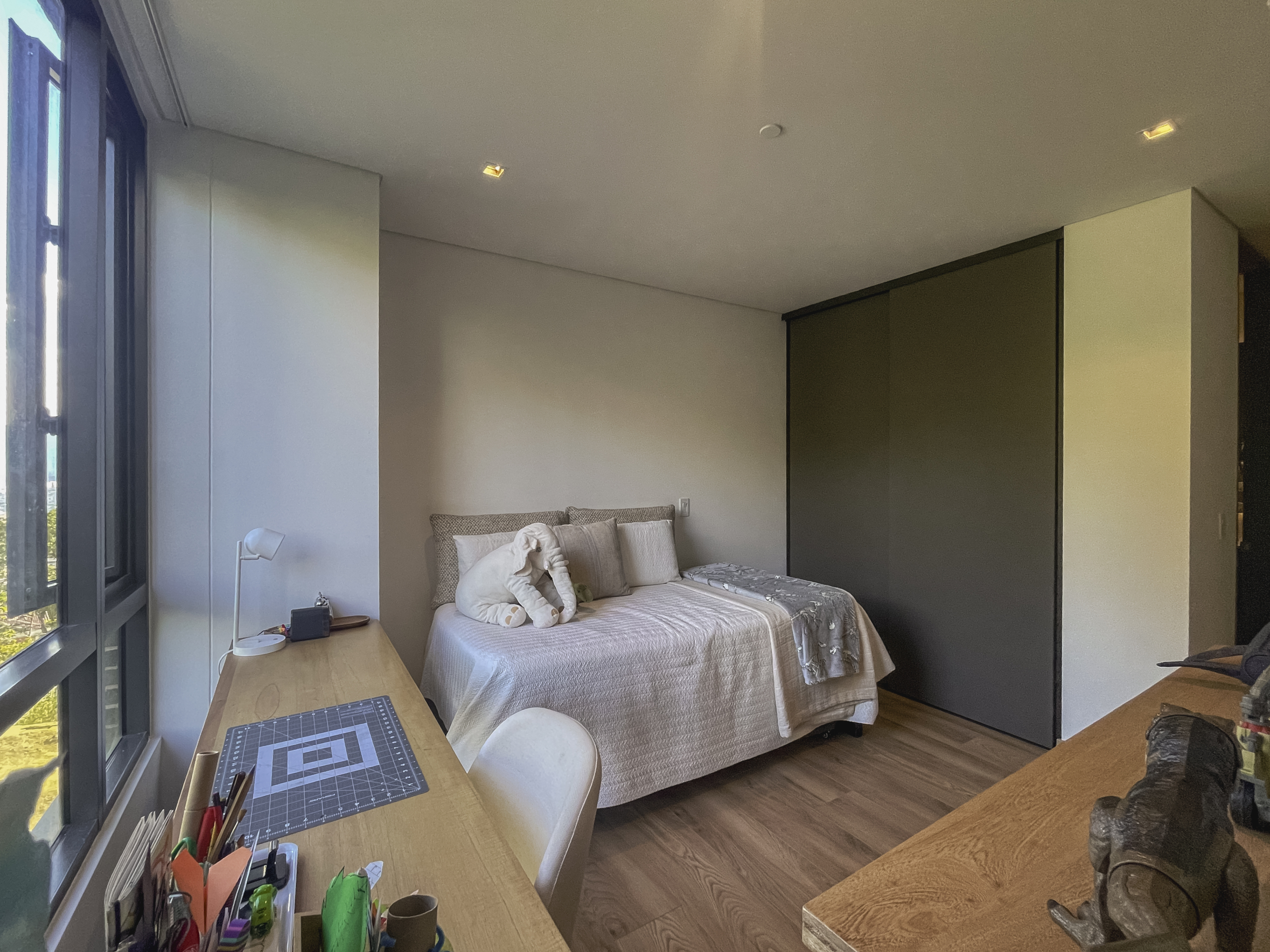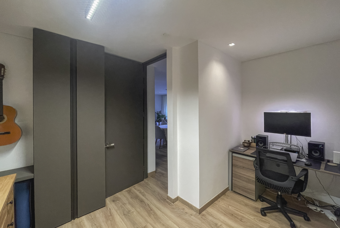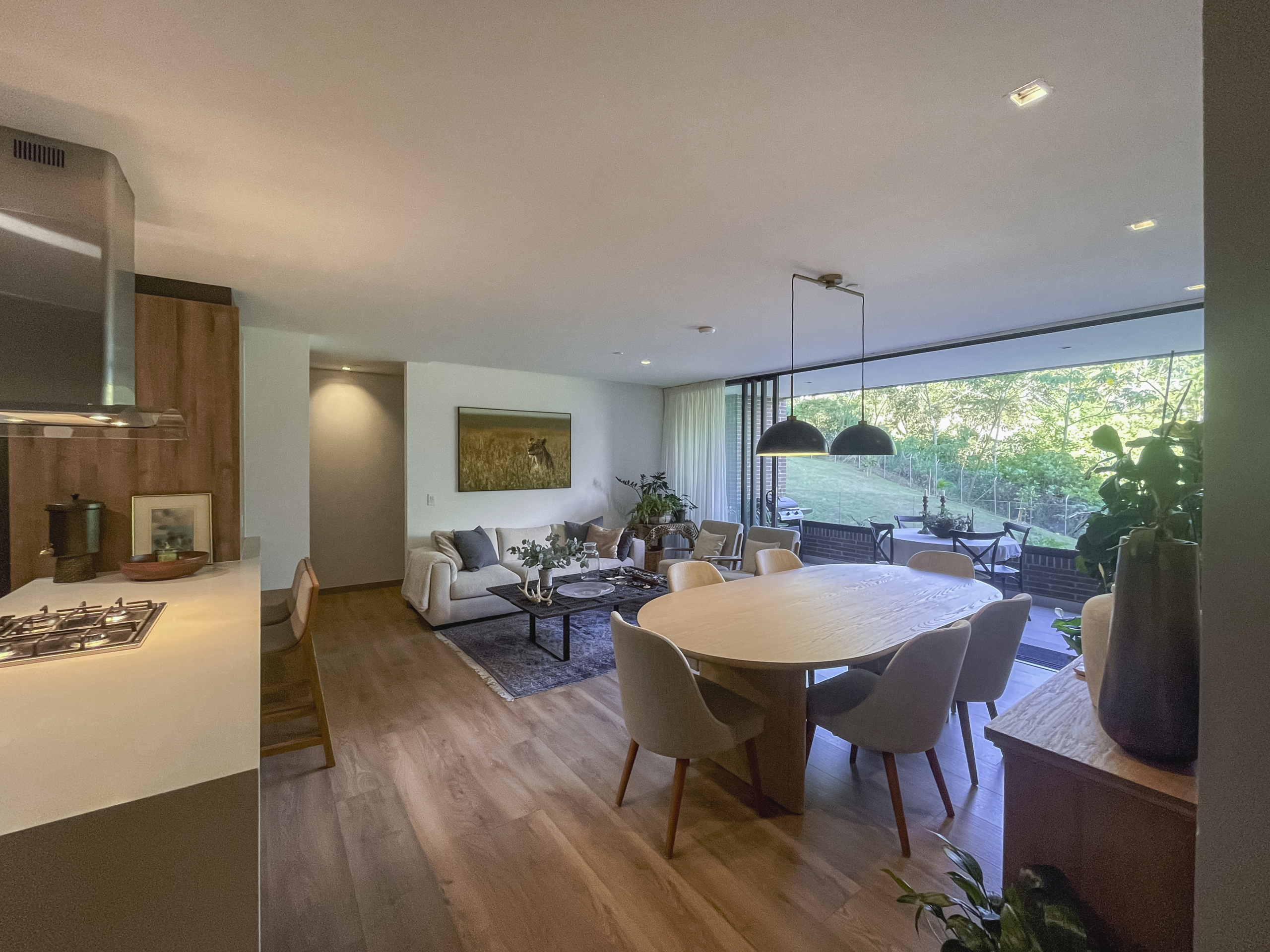 Moderno apartamento ubicado en el sector de las palmas, sitio tranquilo rodeado de naturaleza. Área: 117,5 metros2. Comodidades: sala, comedor, cocina abierta, zona de ropas, baño social, 2 alcobas con baño, principal con vestier y la otra con clóset, estudio, balcón. 2 parqueaderos, cuarto útil.